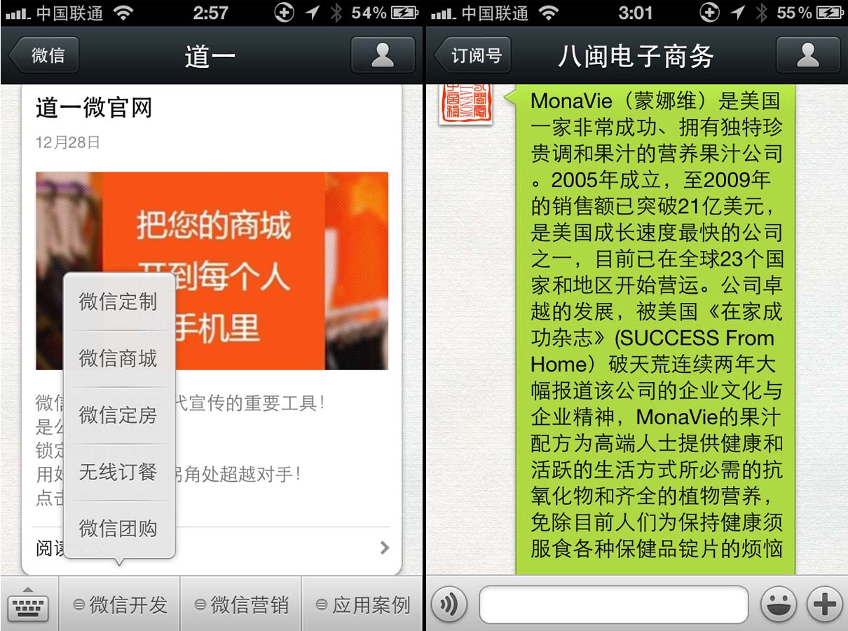 2、發(fā)給訂閱用戶(粉絲)的消息,會(huì)顯示在對(duì)方的聊天列表中。相對(duì)應(yīng)微信的首頁。